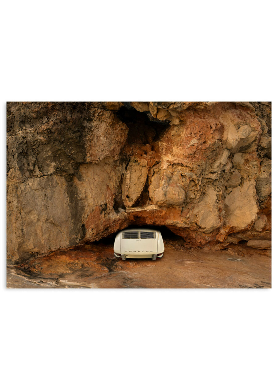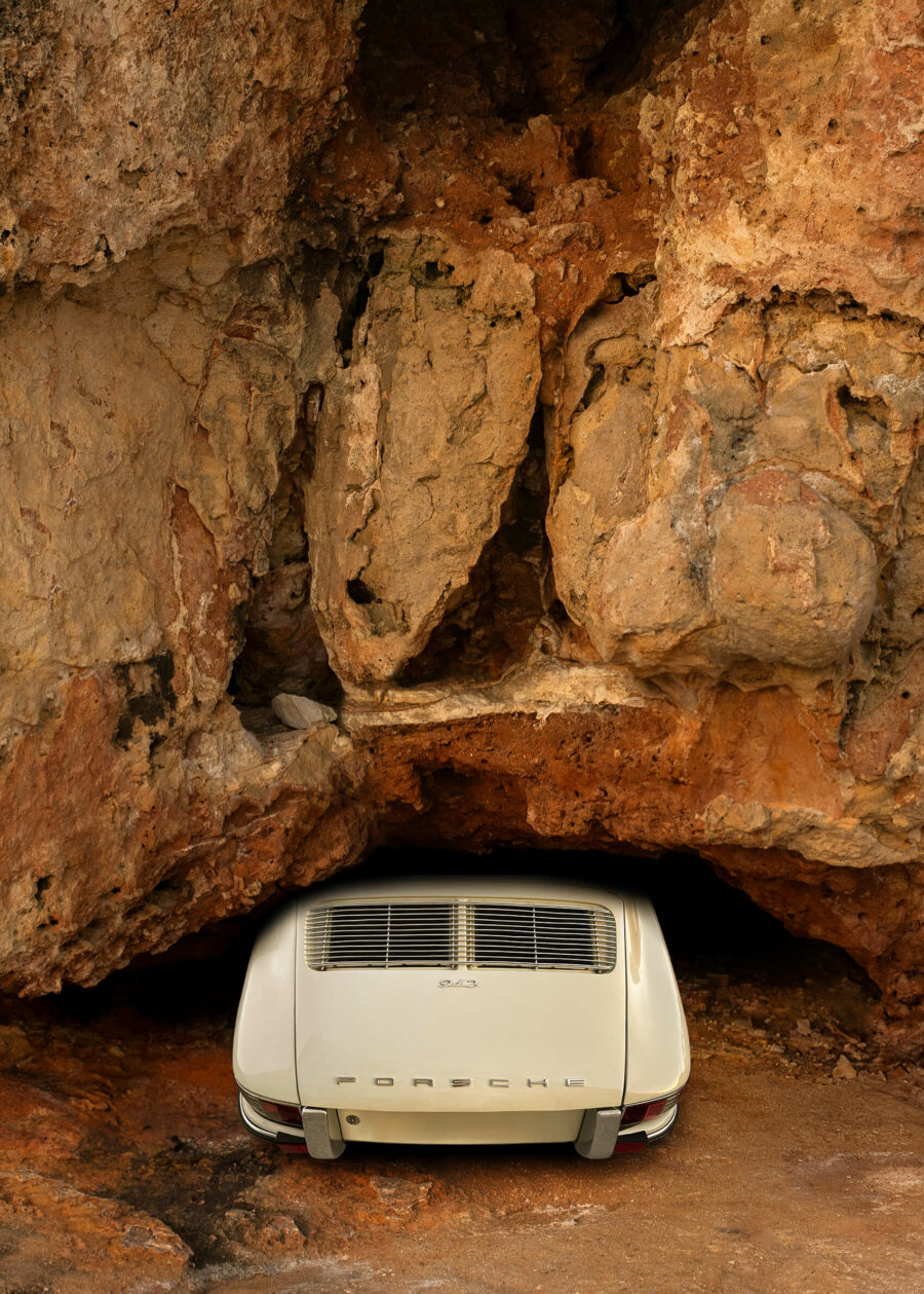 A photo collage with white Porsche 930 turbo in a color splash, inspired by 75 anniversary of Porsche.