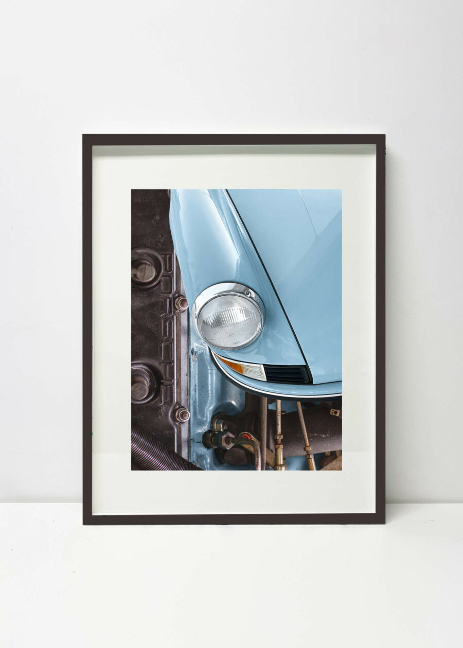 One-of-a-kind artwork. A photo collage with white Porsche 930 turbo in a color splash, inspired by 75 anniversary of Porsche and matching hand painted wooden frame.